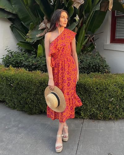 BTFBM Women's One Shoulder Maxi Dress Sleeveless Casual Summer Layered Ruffle Boho Floral Print Party Beach A-Line Dresses