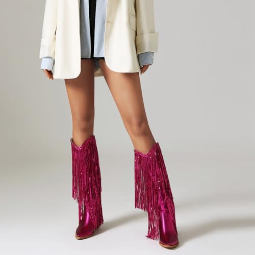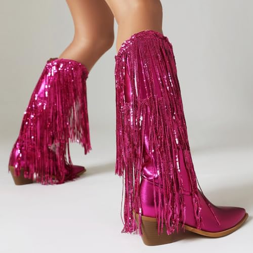 Why Choose KiutSymo Womens Fringe Metallic Cowboy Boots Pointed Toe Block Chunky Heel Tassel Cowgirl Western Mid Calf Boots Dress Party Boots?