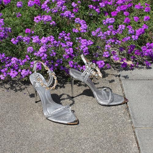 Women’s Black Stiletto Sandals with Gold Chain Ankle Strap — Open Toe Pointed Toe Heels for Wedding Party Evening Wear