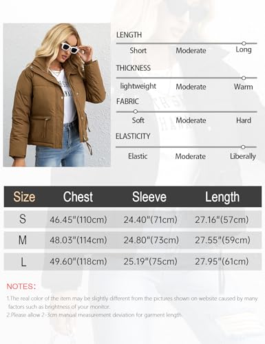 Fabric type: Fabric: 100% PolyesterCare instructions: Machine WashOrigin: ImportedFabric: 100% Polyester. Non-shrink material retains its shape even after multiple washes. - Lightweight polyester ensures a comfortable and hassle-free experience.Design: Winter lightweight puffer jackets, stand up collar, full zipper and button down closure, ribbed cuffs, zipper pockets, adjustable drawstrings on the hem, the quilted design of this jacket creates a puffy appearance, giving it a sleek and trendy look, enhancing your overall style while providing extra insulation.Winter: Stay warm and cozy during the chilly season with this women's winter cropped puffer jacket. Its insulating design keeps you snug when the temperatures drop, ensuring you stay comfortable throughout the winter months.Washing Tips: Machine washable, do not bleach, avoid washing with hot water.SIZE: All sizes are US sizes. Please order according to your daily shopping habits. S=US(4-6), M=US(8-10), L=US(12-14), XL=US(16-18) Perfect for everyday use. premium materials and excellent craftsmanship ensure long-lasting durability.