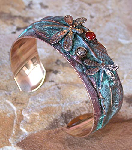 - Verdigris Patina Dragonflies on Feather Wearable Art Cuff Bracelet - Carnelian Jasper