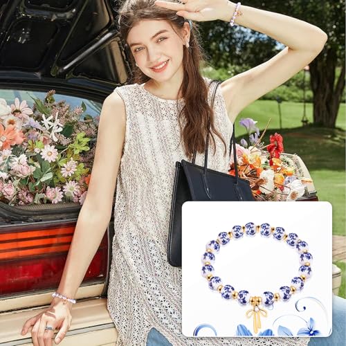 Material: PolyesterMetal type: No Metal TypeClasp type: Hook & LoopChain type: StretchGem type: No gemstoneRetro Floral Charm: Features stunning blue-and-white floral-patterned ceramic beads inspired by classic blue and white porcelain, paired with polished gold accent beads which blends vintage nostalgia with timeless elegance, perfect for adding a touch of old-world beauty to any outfit.Thoughtful Romantic Gift: This bracelet is a perfect choice for birthdays, Valentine’s Day, anniversaries, or as a Christmas surprise. Surprise your girlfriend, wife, mom, or best friend—she’ll love the sentimental, handcrafted touch!Handmade Quality: Each bracelet is carefully strung by hand, ensuring unique, high-craftsmanship details. The elastic stretch design fits most wrist sizes for comfortable, hassle-free wear.Sparkling Bow Detail: A dainty gold-plated bow charm with a tiny crystal center hangs from the bracelet—adds a romantic, feminine flair that catches the light beautifully. The perfect finishing touch for date nights or special occasionsDurable & Chic: Made with scratch-resistant ceramic beads and anti-tarnish gold-plated metal that stays vibrant even with daily wear. Lightweight and dainty, it’s ideal for layering with other bracelets or wearing alone as a statement piece. Perfect for everyday use. premium materials and excellent craftsmanship ensure long-lasting durability.