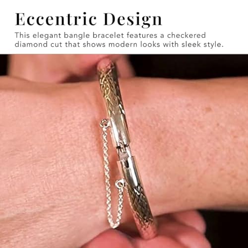 Item display length: 7 inchesMetal type: Sterling SilverClasp type: Lobster ClawChain type: Bead ChainGem type: No gemstoneECCENTRIC DESIGN - This elegant bangle bracelet features a checkered diamond cut that shows modern looks with sleek style. this classic dainty bracelet is perfect to pair with any formal or casual attire.925 STERLING SILVER - This classy fashionable chic bracelet is made of 925 sterling silver, known for natural elegance. the breath-taking dazzle of diamond-cut lands makes a boundless appeal. this makes it your signature mark in day-to-day wear.SIZE - This charming bracelet is 2.5 h x 3.5 w. the bangle is 7 inches in length and comes with a fancy clasp for easy wearing, net weight: 8.4 gms. this minimalistic jewel will add plenty of shine to your hand.IDEAL GIFT - Perfect jewelry gift to expand a woman' fashion wardrobe with a classic, timeless style. You can gift it to your women, sister, & classmates or on birthdays, Wedding, mother' day, thanksgiving, Christmas.6-MONTH WARRANTY - Buy silver jewelry for women with a 6-month warranty limited to manufacturing defects. Enjoy exceptional customer support when purchasing charm bracelets for women, women' jewelry, silver bangles bracelets for women, cuff bracelets for women and boho jewelry for women. Perfect for everyday use. excellent materials and excellent craftsmanship ensure long-lasting durability.