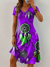 More information about Women's Mini Dress Casual Dress T Shirt Dress Tee Dress Sundress A Line Dress Vacation Casual Boho Beach Regular Fit Graphic Feather Short Sleeve V Neck Blue Purple Orange Green Summer Spring