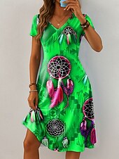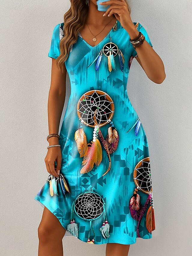 trending ! Women's Mini Dress Casual Dress T Shirt Dress Tee Dress Sundress A Line Dress Vacation Casual Boho Beach Regular Fit Graphic Feather Short Sleeve V Neck Blue Purple Orange Green Summer Spring