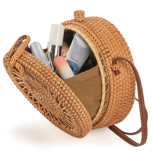 Fabric type: RattanClosure type: ClaspLining: Soft fabricOkllen round rattan bag measures 7.8D x 3.1W, and 51.5 in the length of the strap, offers ample storage space for your daily essentials, great serve as a shoulder bag, retro purse, handbag or crossbody bag.premium Bag: Each round rattan bag made from sustainable, natural Vietnamese rattan, meticulously handwoven by skilled Vietnamese artisans. The intricate patterns and textures created by the weaving add a unique and authentic touch to the overall design.Crafted with meticulous attention to detail, the shoulder strap of this handwoven bag is expertly comfort and convenience, ensuring the perfect fit for your body type. It allows you to effortlessly carry your essentials while keeping your hands free.The spacious straw bag is lined with a soft fabric, protecting your belongings from scratches. It can comfortably accommodate your wallet, sunglasses, mobile phone, keys, and other small items.Whether youβre strolling along the seaside, exploring a tropical paradise, or simply out for a casual day in the city, this rattan shoulder bag is the perfect accessory to complete your bohemian look. Its versatility and unique design make it a must-have gift for every sleek woman or fashionista. Perfect for everyday use. High quality materials and excellent craftsmanship ensure long-lasting durability.
