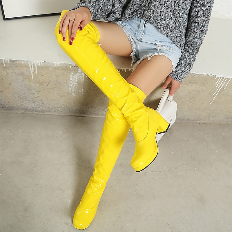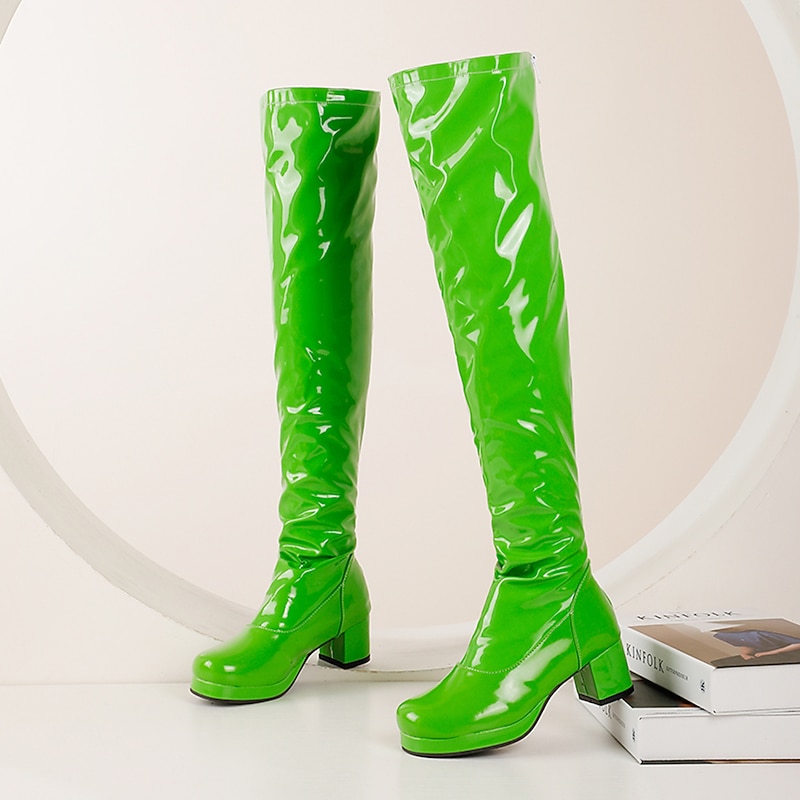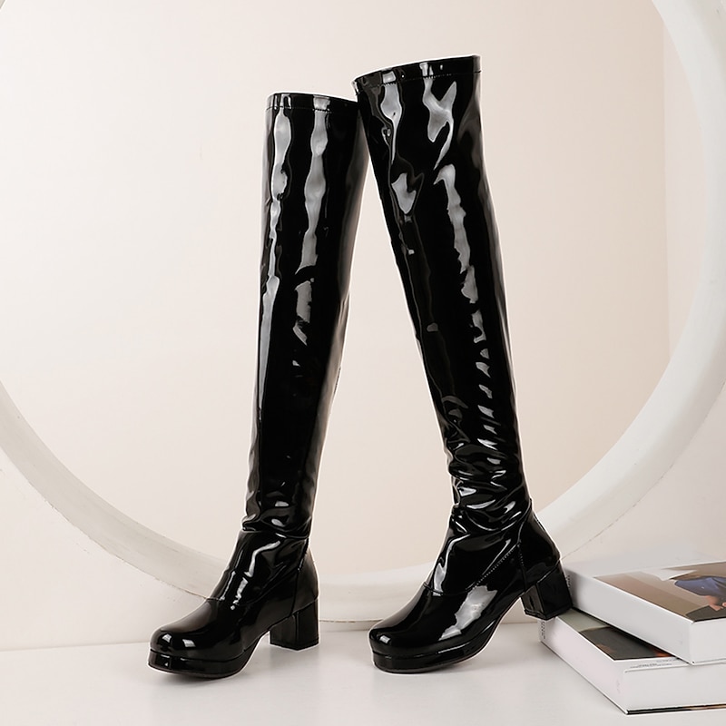 trending ! Women's Black Patent Leather Over-the-Knee Boots with Chunky Heel, contemporary and Sleek for Night Out and Party Wear