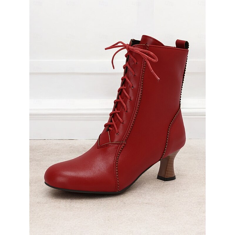 Victorian Style Women's Red Lace-Up Faux Leather Ankle Boots with Mid Heel - Retro Vintage-Inspired Footwear for Formal or Casual Wear