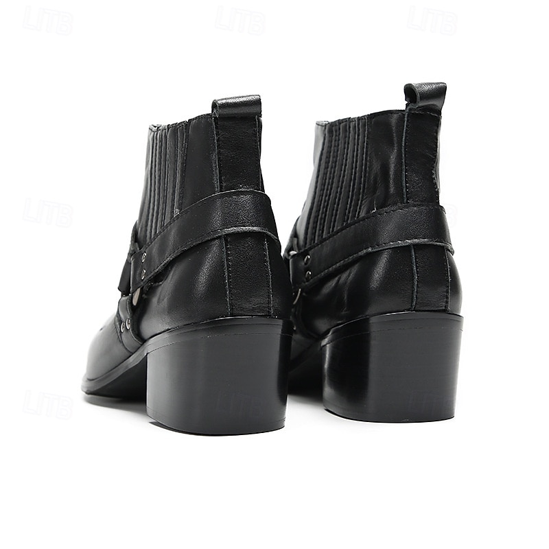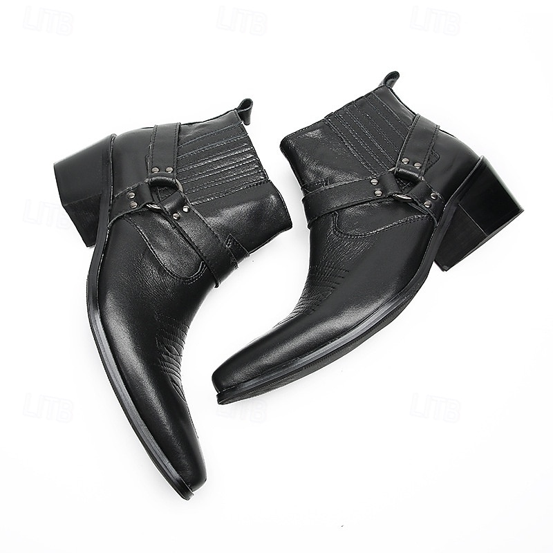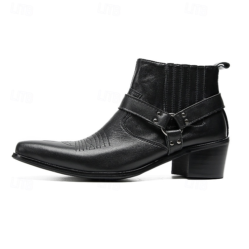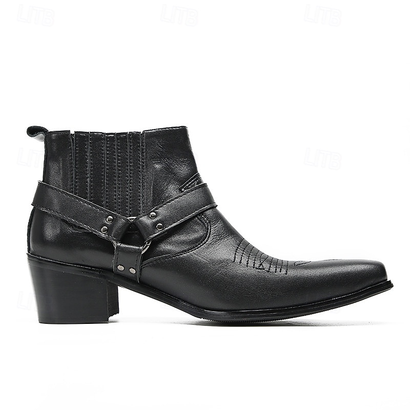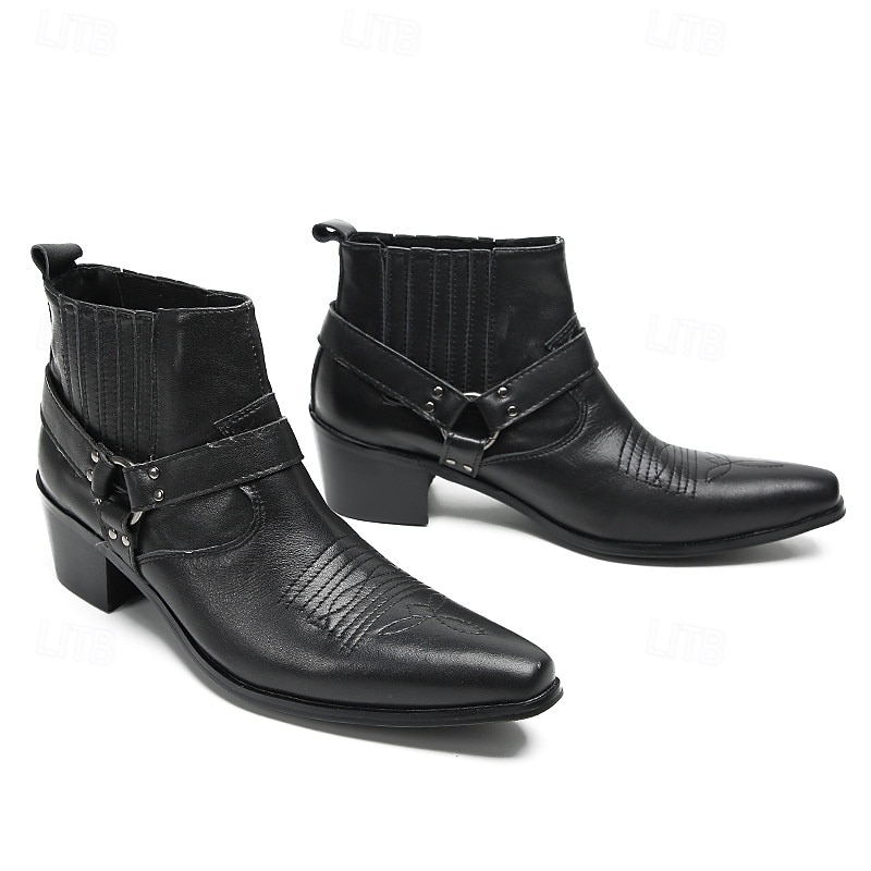 More information about Men's Genuine Leather Black Harness Boots with Pointed Toe and Block Heel, Cowhide Motorcycle Cowboy Boots for Stage, Parties and Rock Style Outfits