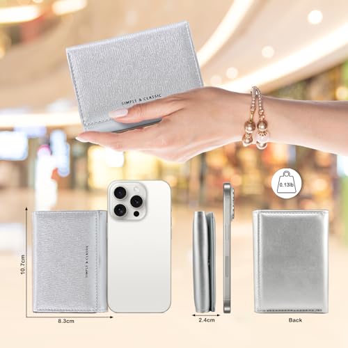 Womens Wallet Small Trifold Slim Pearlescent Trendy Leather Glitter Cute Wallet Cash Pocket with Coin Purse ID Window Card Holder for Girls (Silver)