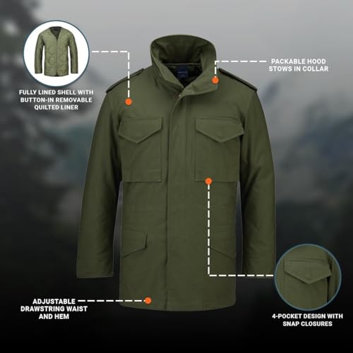 Fabric type: 50% Nylon, 50% Cotton SateenCare instructions: Machine WashOrigin: ImportedAUTHENTIC DESIGN – This M65 coat is built from military specifications down to its authentic NYCO sateen fabric, unlike many imitators using lower quality polyester blend fabrics. It offers a layering design that allows for use in any element or for casual wear.FUNCTIONALITY – Versatile coat with a storm flap and Vislon zipper, fully lined shell with a button-in removable quilted liner, and a packable hood hidden in the collar. It is the perfect fit for any weather or storm and will keep you warm and dry.COMFORTABLE FIT – With a loose fit across the shoulders, you have full mobility and range of motion while wearing the coat. There is an adjustable drawstring at the waist and bottom to accommodate any fit.STORAGE – There are 4 snap closure pockets conveniently located on the front of the coat for easy access and plenty of storage for your belongings.MATERIAL & CARE – treated with a durable water repellent to resist dirt and moisture. For fabric care, wash with a mild detergent in cold water and tumble dry on a low, warm, and gentle cycle. Perfect for everyday use. High quality materials and excellent craftsmanship ensure long-lasting durability.