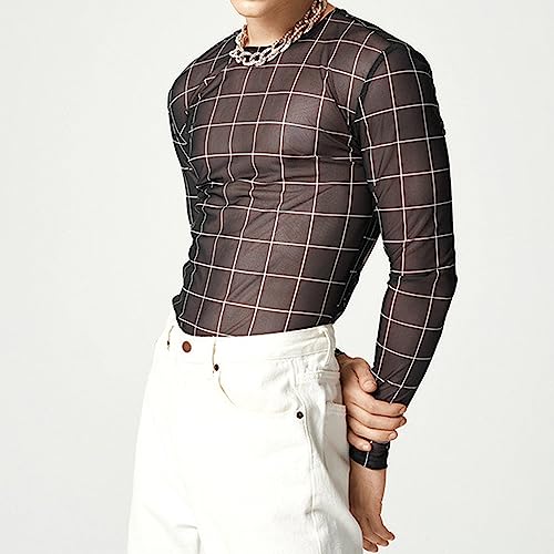 trending ! Evankin Mens Sexy Lace Shirt Top See Through Grid Print Long Sleeve T-Shirt Sheer Mesh Undershirts for Male