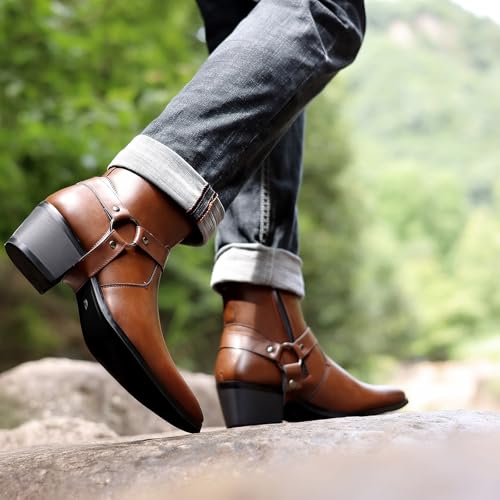 trending ! Men's Leather Chunky Heel Dress Chelsea Boots with Three Prong Buckle Fashion vintage Cap Toe Side Zipper High Heel High Top Formal Oxford Shoes Casual Business Wedding Chukka Booties