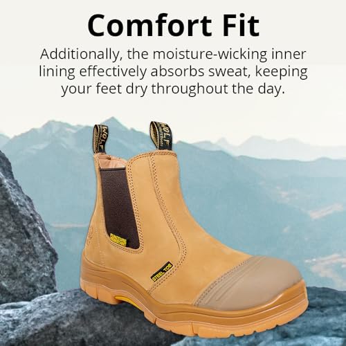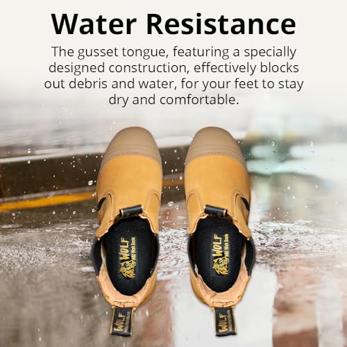 Origin: ImportedSole material: RubberOuter material: LeatherClosure type: Pull-OnOIL and SLIP RESISTANT – Our durable work boots are crafted from premium 100% genuine leather that effectively repels oil. Designed with a non-slip sole, these boots ensure safety in harsh work environments. They are also resistant to abrasion. The premium rubber material provides excellent anti-slip performance on various surfaces. These boots will keep you secure even on rainy days, making them the perfect choice for outdoor construction work.COMFORT FIT – Our shock absorption technology ensures a reduction in foot fatigue, provides excellent arch support, and offers cushioning for every step. The lightweight boot is equipped with a wedge rubber sole and polyurethane cushioning in the mid and insole, providing optimal comfort. The high-quality insulated rubber offers a comfortable slip-resistant wearing experience. Additionally, the moisture-wicking inner lining effectively absorbs sweat, keeping your feet dry throughout the day.BUILT STRONG – Constructed with a substantially durable wedge rubber sole, this footwear offers exceptional strength. Its flexible and slip-resistant sole provides added protection during work. Flexible slip-on ankle guarantees a secure fit, allowing the boot to conform to your foot securely. Additionally, the gusset tongue aids in preventing debris and water from entering.STEEL TOE –These steel toe boots exhibit exceptional reliability and durability. They are equipped with a rubber granule protective shell that safeguards the steel toe, ensuring resistance against punctures and protection for the toes. With the presence of the sturdy steel toe cap, worries about potential injuries from hard objects falling on the toes are eliminated. This cap is specifically designed to shield the toes from high impact falling objects and compression.SERVICE – Our team will quickly answer all your questions and concerns about your order. WOLF products are premium stylish safety products designed by Americans with American Standard level of quality. If you have a problem, we have a solution. Perfect for everyday use. High quality materials and excellent craftsmanship ensure long-lasting durability.